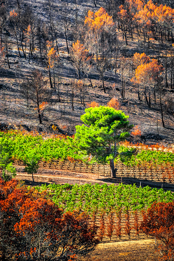 Depuis les collines de Ribaute, le feu s’est étendu, effleurant seize communes comme un souffle imprévu. Mais ce sont les pinèdes chantantes, les chemins de randonnée bordés de thym et de romarin et les vignes au matin, qui ont vu leurs couleurs s’éteindre sous l’ardente main.