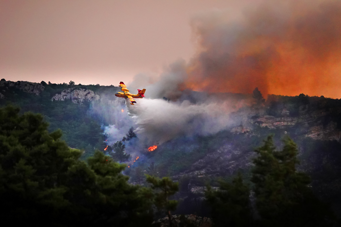 Mardi 5 août à 16 h 15, depuis la route des Corbières, un immense nuage s’élève dans le ciel — un présage inquiétant. Un peu plus d’une heure plus tard, les premiers canadairs apparaissent : trois canadairs surgissent, oiseaux d’aluminium au ventre d’eau. Ils seront neufs à danser dans les cieux, trois jours durant, au rythme des flammes et du vent.