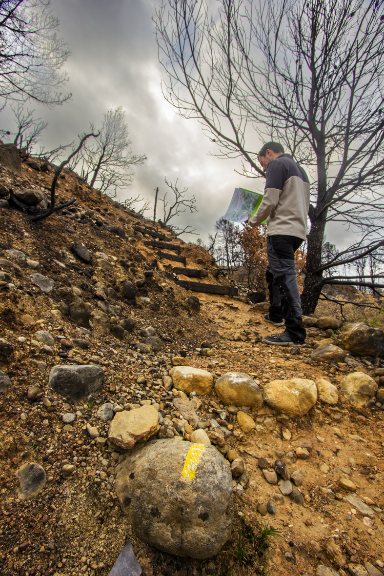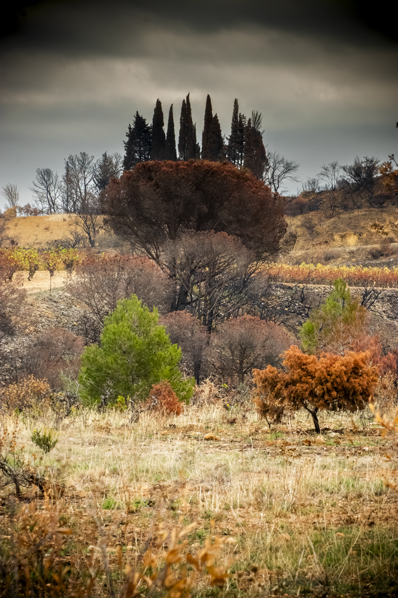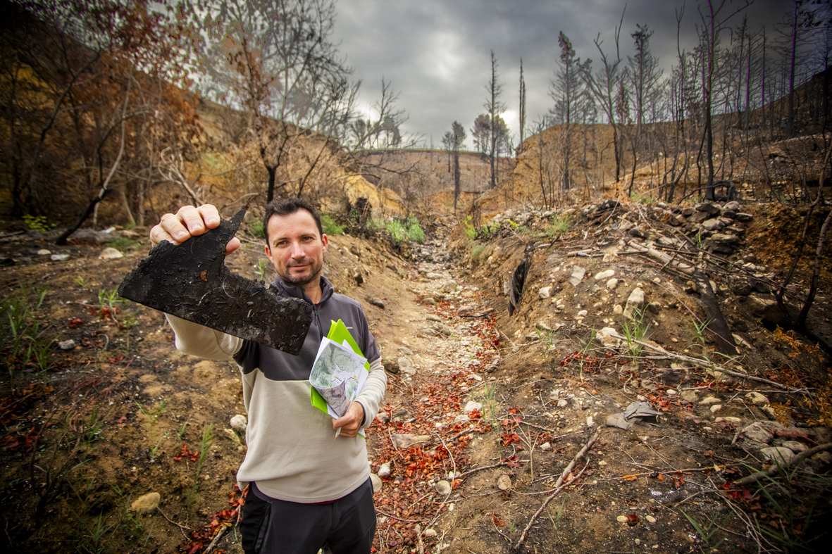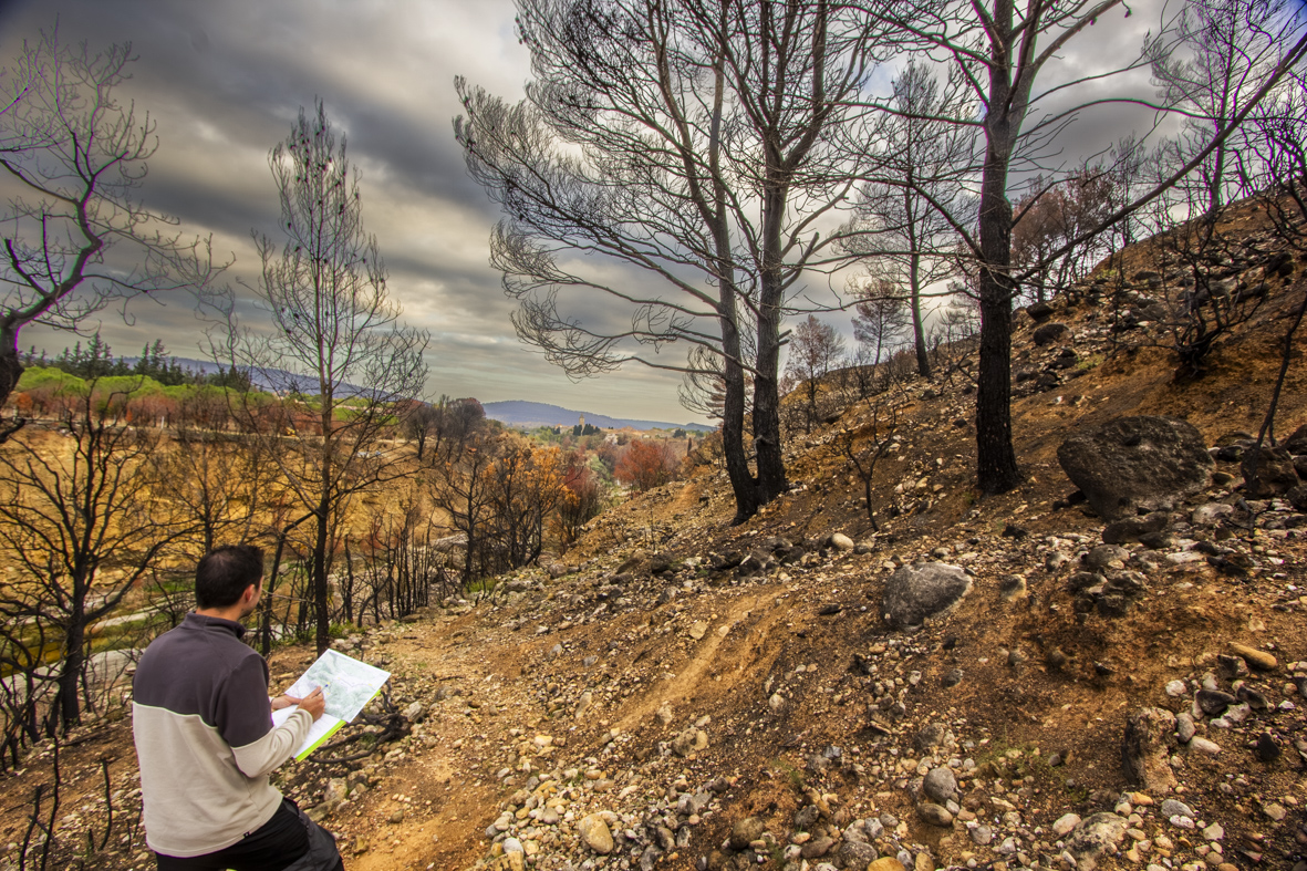 Munis d’une fiche sentier détaillant les équipements, d’une carte IGN et de leur téléphone, Romain et Cédric sillonnent les kilomètres de terres calcinées. Le paysage est marqué par des teintes sombres — noir, rouille, quelques touches de vert — une atmosphère silencieuse, une odeur persistante de brûlé, et une vie animale encore discrète, à l’exception de quelques fourmis. La nature semble en pause… mais sa résilience est déjà à l’œuvre.