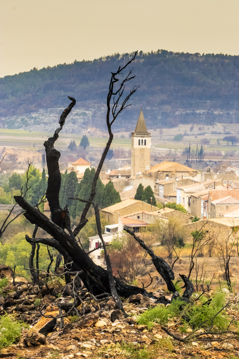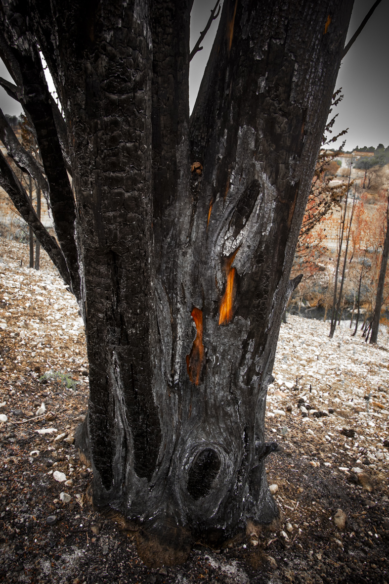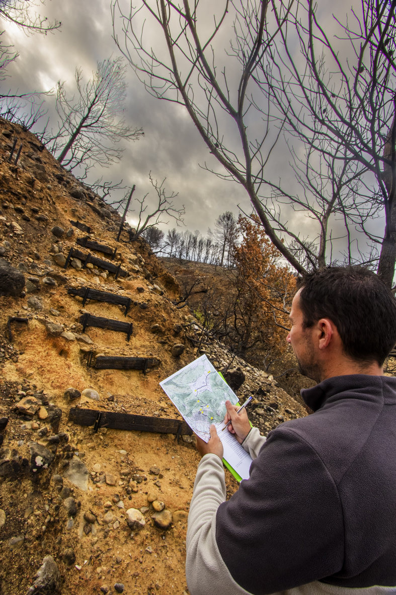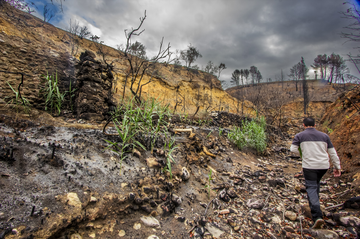 Munis d’une fiche sentier détaillant les équipements, d’une carte IGN et de leur téléphone, Romain et Cédric sillonnent les kilomètres de terres calcinées. Le paysage est marqué par des teintes sombres — noir, rouille, quelques touches de vert — une atmosphère silencieuse, une odeur persistante de brûlé, et une vie animale encore discrète, à l’exception de quelques fourmis. La nature semble en pause… mais sa résilience est déjà à l’œuvre.