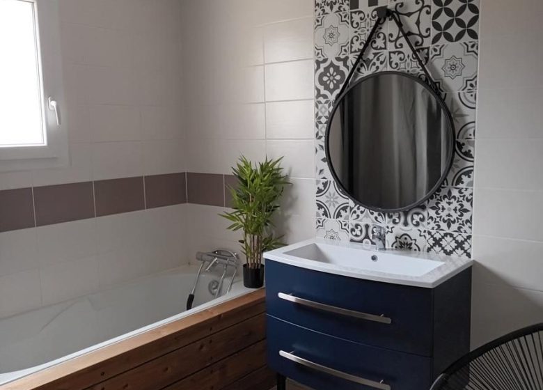 Gîte de plain pied accessible par une petite pente, comprenant: un grand séjour cuisine donnant sur la terrasse, coin salon TV avec canal+/ canalsat. Cellier.