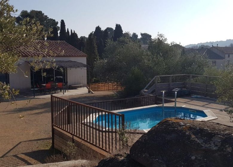 Grande terrasse sur place avec salon de jardin et barbecue. Piscine hors-sol (4,90 x 2,90) avec plages bois. Parking dans la propriété.