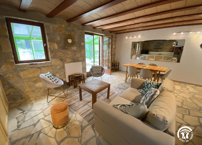 _Entrée par une véranda, donnant sur le séjour avec TV, cuisine aménagée et équipée,