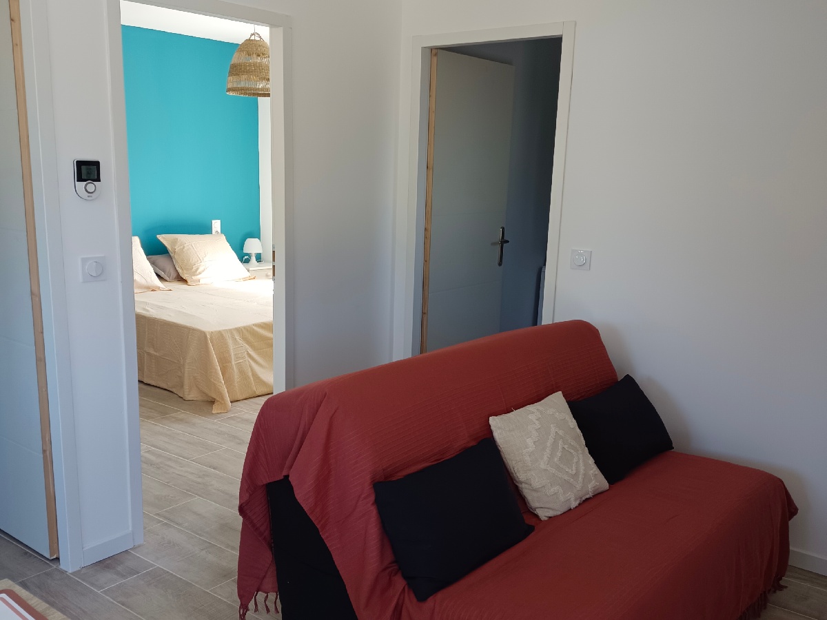 Charmante petite maison cosy individuelle avec deux grandes chambres : une avec un lit en 160, l'autre avec un lit en 160 ou possibilité de les séparer en deux lits de 80.