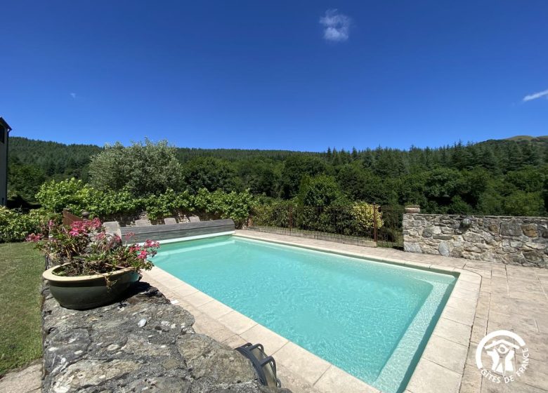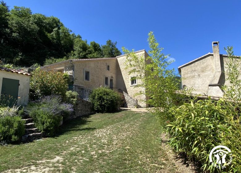 Le gîte s'ouvre sur une terrasse privative équipée de mobilier de jardin et barbecue, avec une piscine à partager (dimensions : 10 x 5 m, sécurisée par une clôture). De plain pied au réz de chaussée d'un autre gîte pouvant se louer communément (11G2889 La Grande Maison), Séjour avec cuisine toute équipée, canapé (possibilité de 2 couchages), poêle à bois, une chambre avec lit 140 et grande salle d'eau-wc attenante atypique adossée aux rocher . Parking sur la propriété. L'accès au domaine se fait par un chemin carrossable de 4 km (10 mn environ), qui vous mènera sur le hameau de 4 maisons dont 2 gites bien indépendant. Sur place : Terrain de pétanque, 2 vélos, 30 km de sentiers et balades pédestres balisés, petit étang avec poissons et barque à 100 m. Commerces ambulants au village à 6 km.