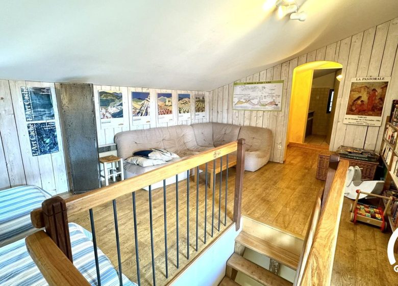 Au second étage :salon avec à disposition un canapé-bibliothèque-jeux pour grands et petits.