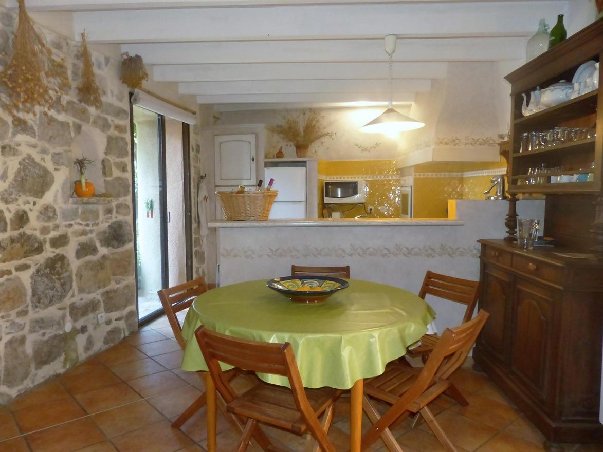 En arrivant dans le gîte, vous serez accueillis par une première cour fleurie très agréable en été. L'entrée de la maison se fait par un long séjour disposant d'un salon avec cheminée. A l'opposé, s'organise l'espace cuisine avec tout l'équipement nécessaire ainsi qu'une grande table. Vous accédez directement sur une véranda-salle à manger pour des dîners conviviaux ainsi qu'à un patio équipé d'un barbecue où vous pourrez profiter d'un petit déjeuner au soleil.