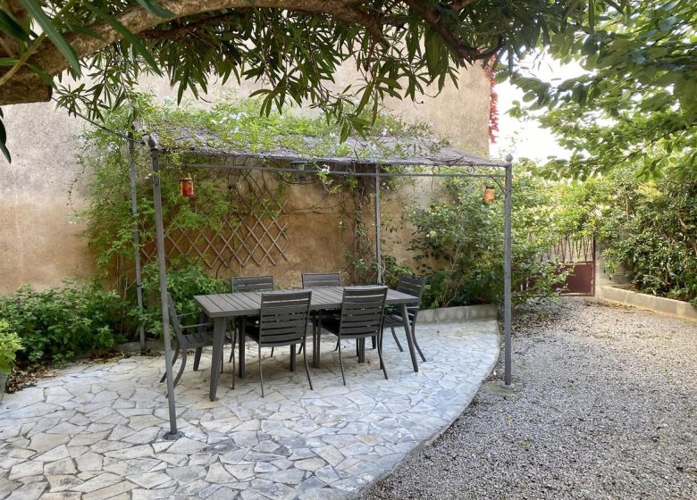 A l'extérieur : depuis le salon, accès à la terrasse ombragée avec mobilier de jardin, un barbecue classique, la cour est sécurisée et close, avec espace parking pour 2 véhicules sécurisé par un portail.