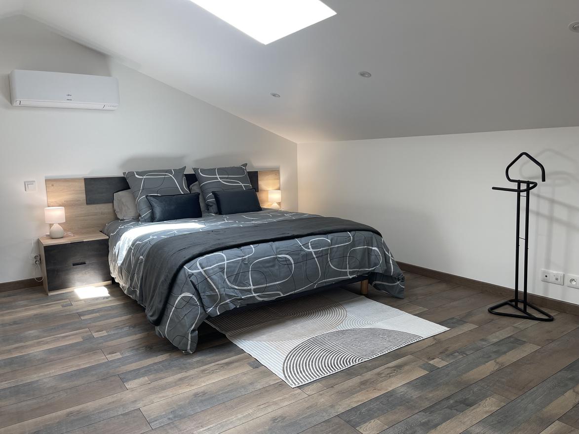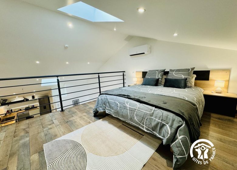 La chambre est située dans une grande mezzanine sécurisée et agréable avec la vue sur le séjour, elle est équipée d'un lit en 160x200cm.
