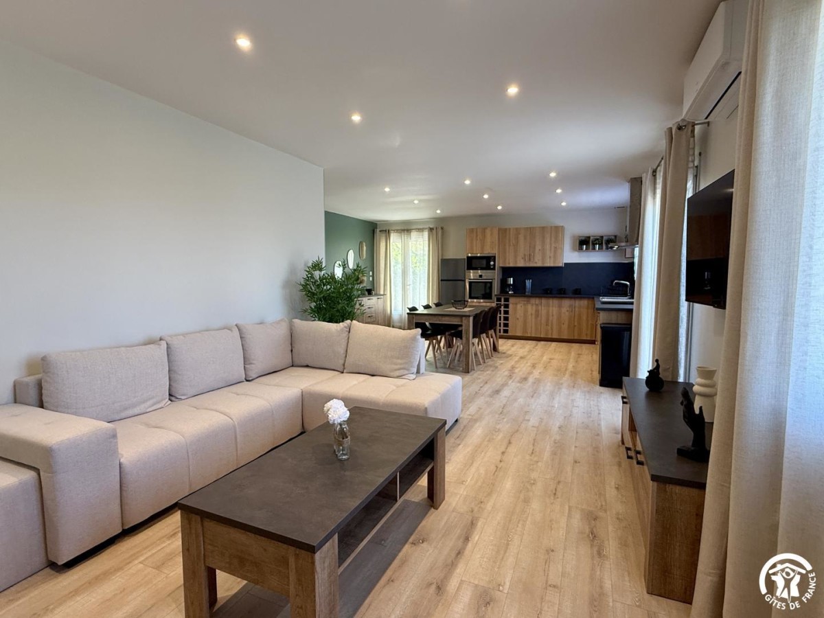 Le rez-de-chaussée s’organise autour d’une agréable pièce à vivre lumineuse, composée d’un salon avec canapé et télévision, et d’une cuisine ouverte entièrement équipée avec four, micro-ondes, plaque à induction, lave-vaisselle, réfrigérateur avec compartiment congélateur et cafetière Nespresso. L’ensemble donne directement accès à la terrasse, facilitant les moments de convivialité entre intérieur et extérieur. Le gîte dispose également de la climatisation réversible, d’un lave-linge, ainsi qu'un WC indépendant.