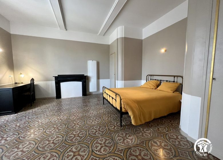 _une chambre avec 1 lit en 140 et baignoire et lavabo privatifs.