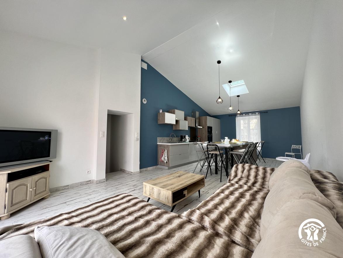 _un séjour avec cuisine donnant sur la terrasse avec salon de jardin et barbecue.