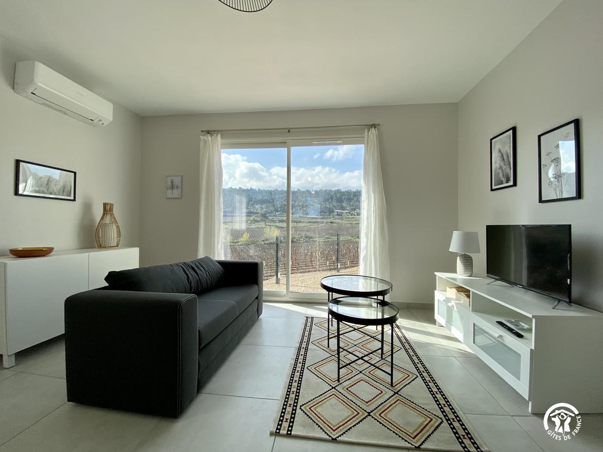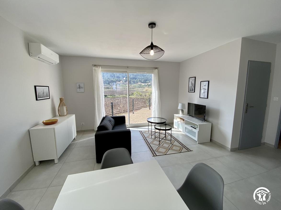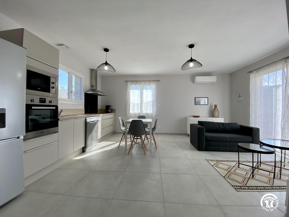 - un séjour avec cuisine, donnant sur l'extérieur équipé d'un salon de jardin.
