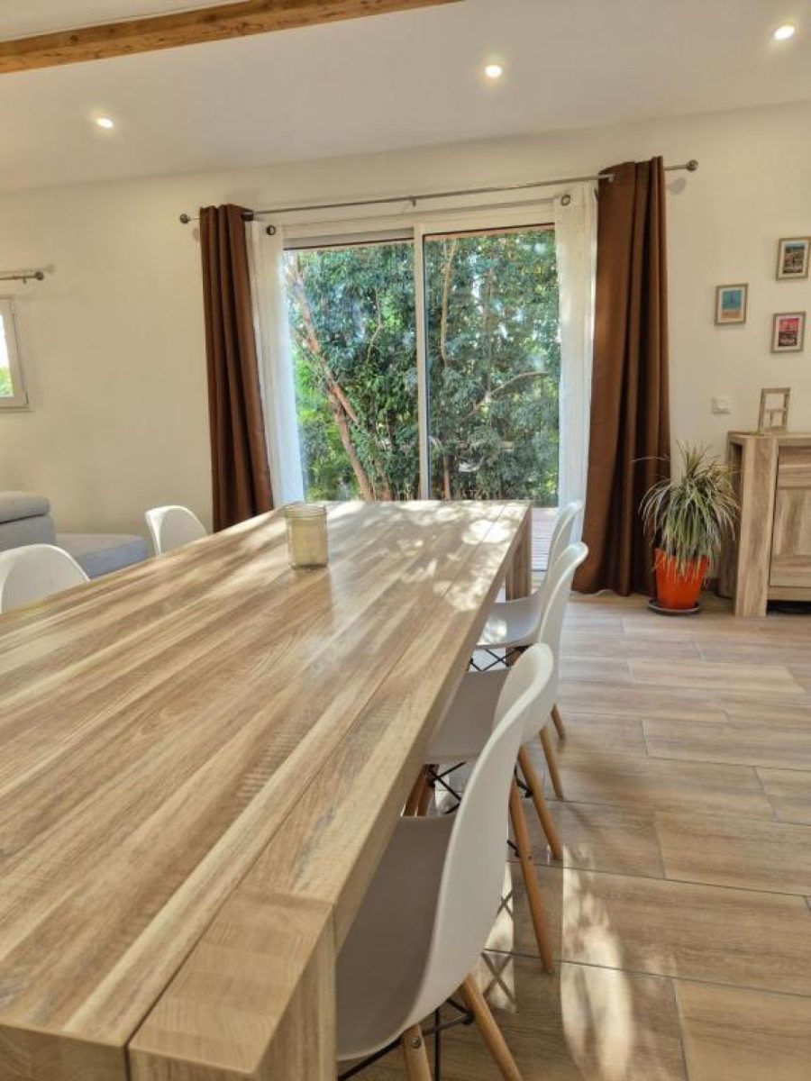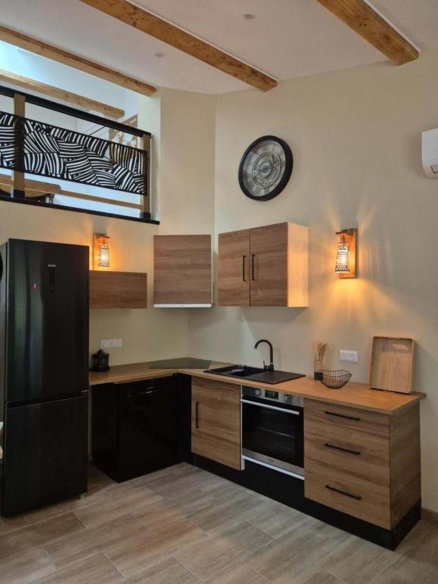 Au rez-de-chaussée, vous trouverez une pièce de vie lumineuse et climatisée avec cuisine ouverte entièrement équipée (four, micro-ondes, plaque à induction, lave-vaisselle, réfrigérateur, congélateur, bouilloire, cafetière italienne avec percolateur), un salon avec canapé d'angle et télévision, une salle d'eau avec double vasques et douche à l'italienne, ainsi que deux chambres :
