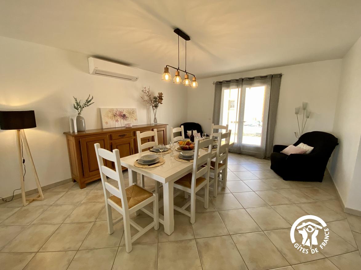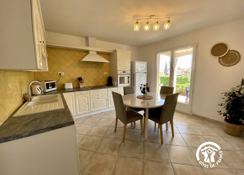 Gîte accessible par quelques marches, puis entièrement de plain pied, comprenant un séjour avec coin salon, une cuisine indépendante donnant sur la terrasse. 2 WC indépendants. Une buanderie. Salle de bain avec baignoire et douche. 3 Chambres avec 2 lits en 160 et 2 lits en 90 jumelables sur demande. Ensemble climatisé.