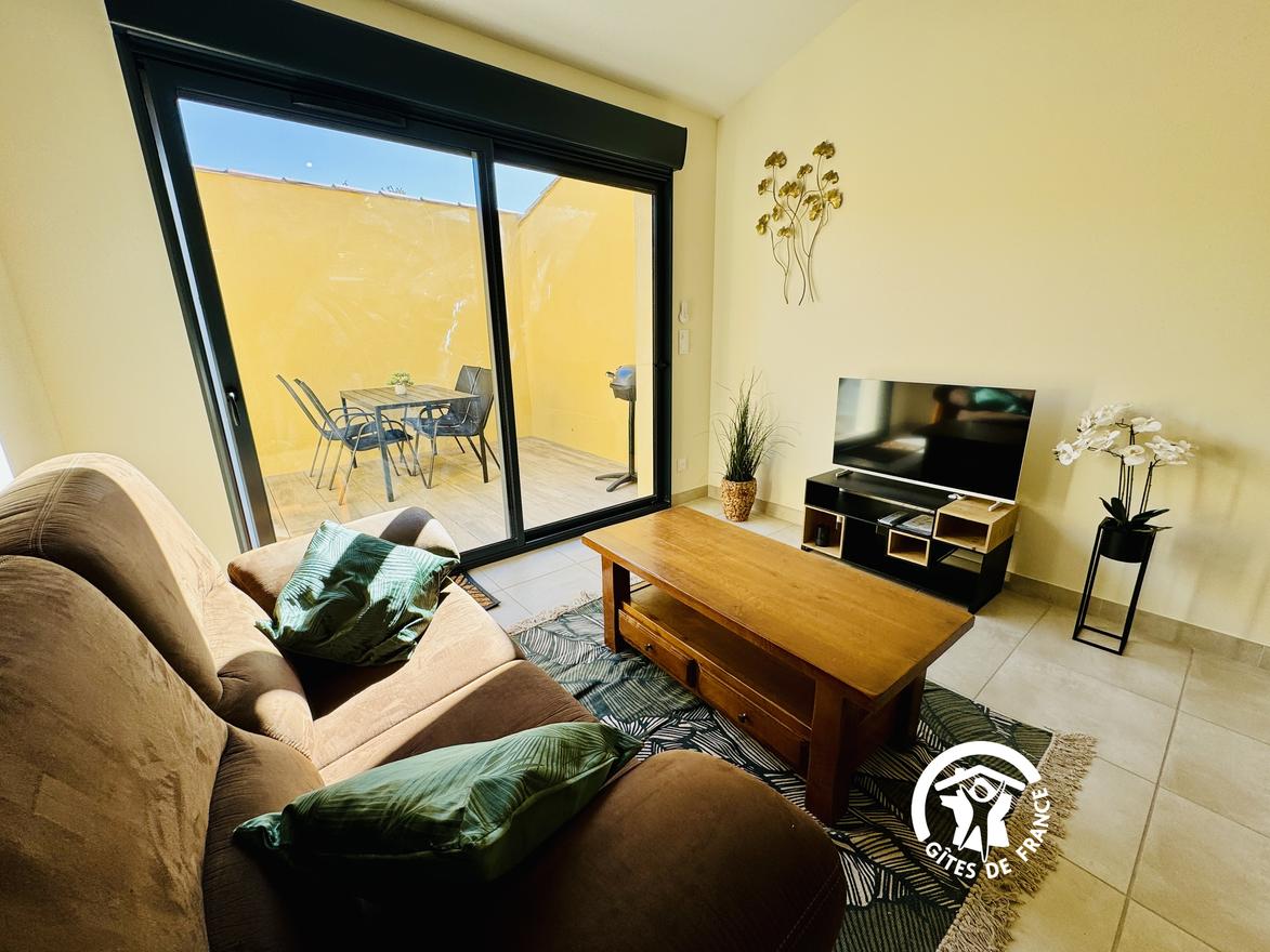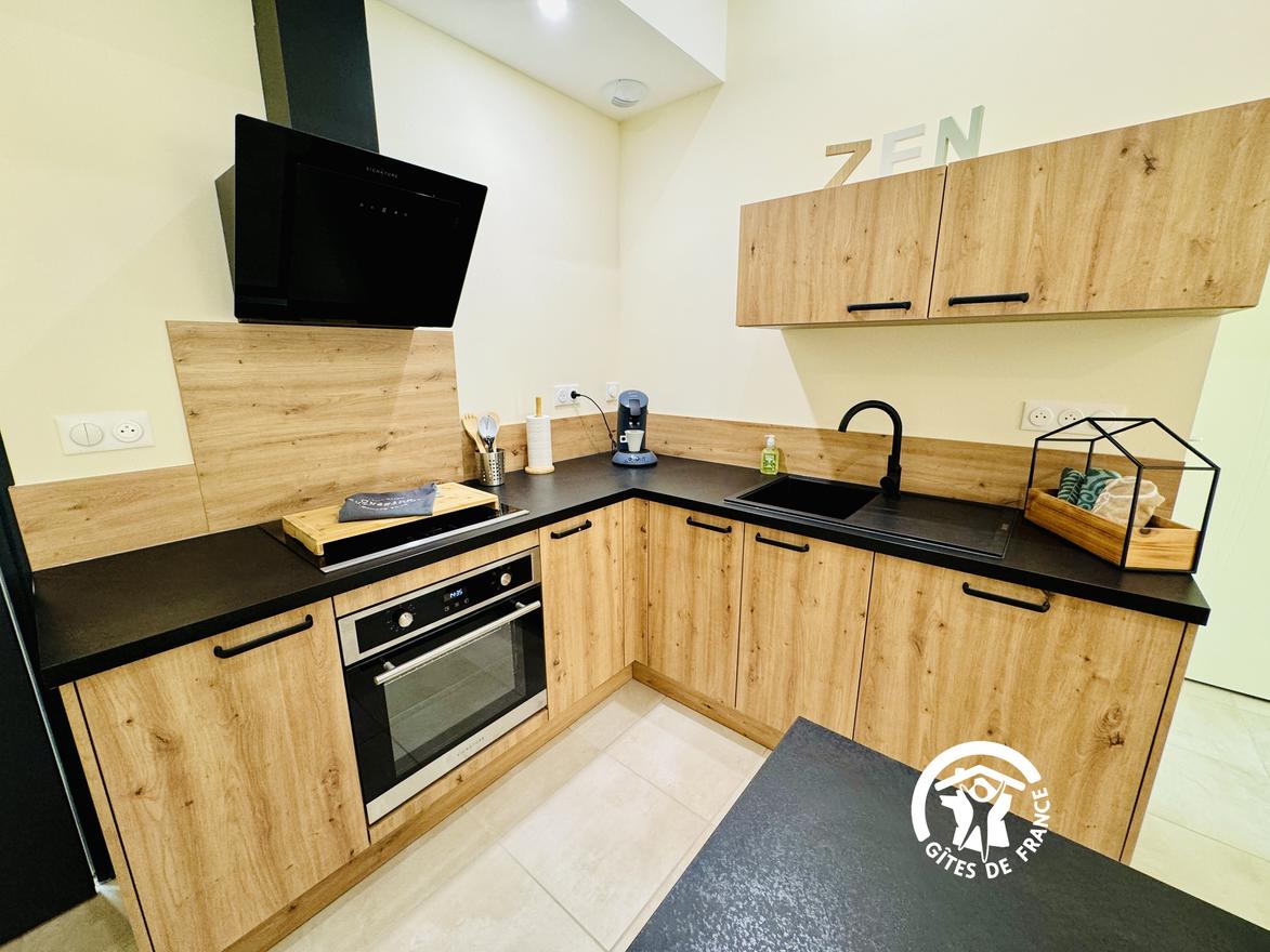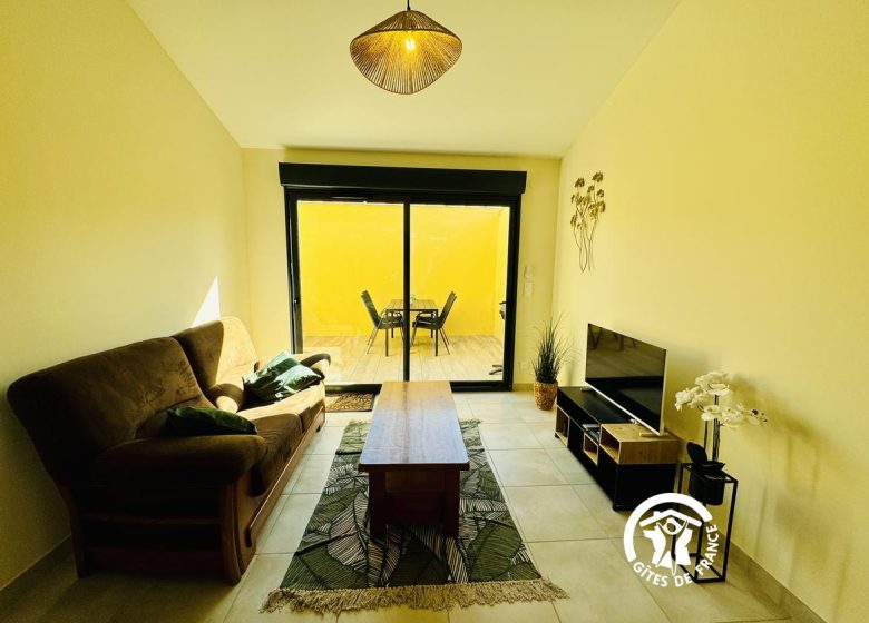 Le gîte climatisé est situé au 1er étage de la bâtisse avec un accès par le sas au rez-de-chaussée, il est mitoyen au second gîte pour 2 personnes, tout en conservant un esprit intimiste. Il s'ouvre sur un grand séjour avec une belle cuisine ouverte et toute équipée, un coin salon avec canapé convertible (pour 2 personnes supplémentaires sur demande) avec une TV, une table à manger et un accès direct à la terrasse. Une chambre indépendante avec un lit 160x200cm et un radiateur avec effet cheminée pour des moments cosy et toujours avec un accès direct à la terrasse. Une salle d'eau indépendante avec douche et lavabo et lave-linge. WC indépendant.